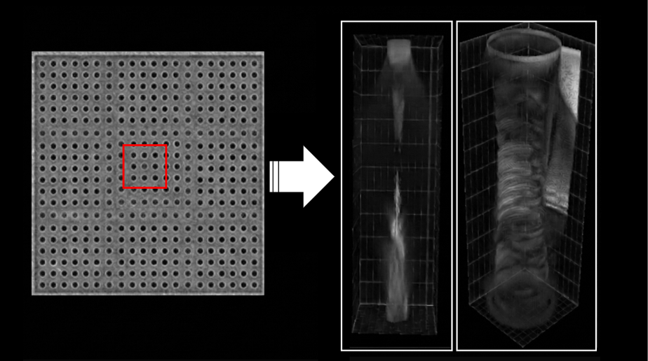 Glass substrates are essential in advanced semiconductor packaging, including glass interposers with fine-pitch, high-aspect-ratio TGVs and glass cores with larger vias in thicker glass layers. Accurate inspection of these structures is critical to ensure product reliability. However, conventional tools often struggle to inspect internal features deeply buried inside the glass — especially tiny cracks or rough surfaces that may lead to failures. Holotomography captures the full 3D structure of vias and surrounding glass non-destructively. It can visualize internal features, sidewalls, subsurface cracks, and even provide cross-sectional images similar to observing a physical cut, without damaging the sample — regardless of via size, depth, or glass thickness (up to 2 mm).